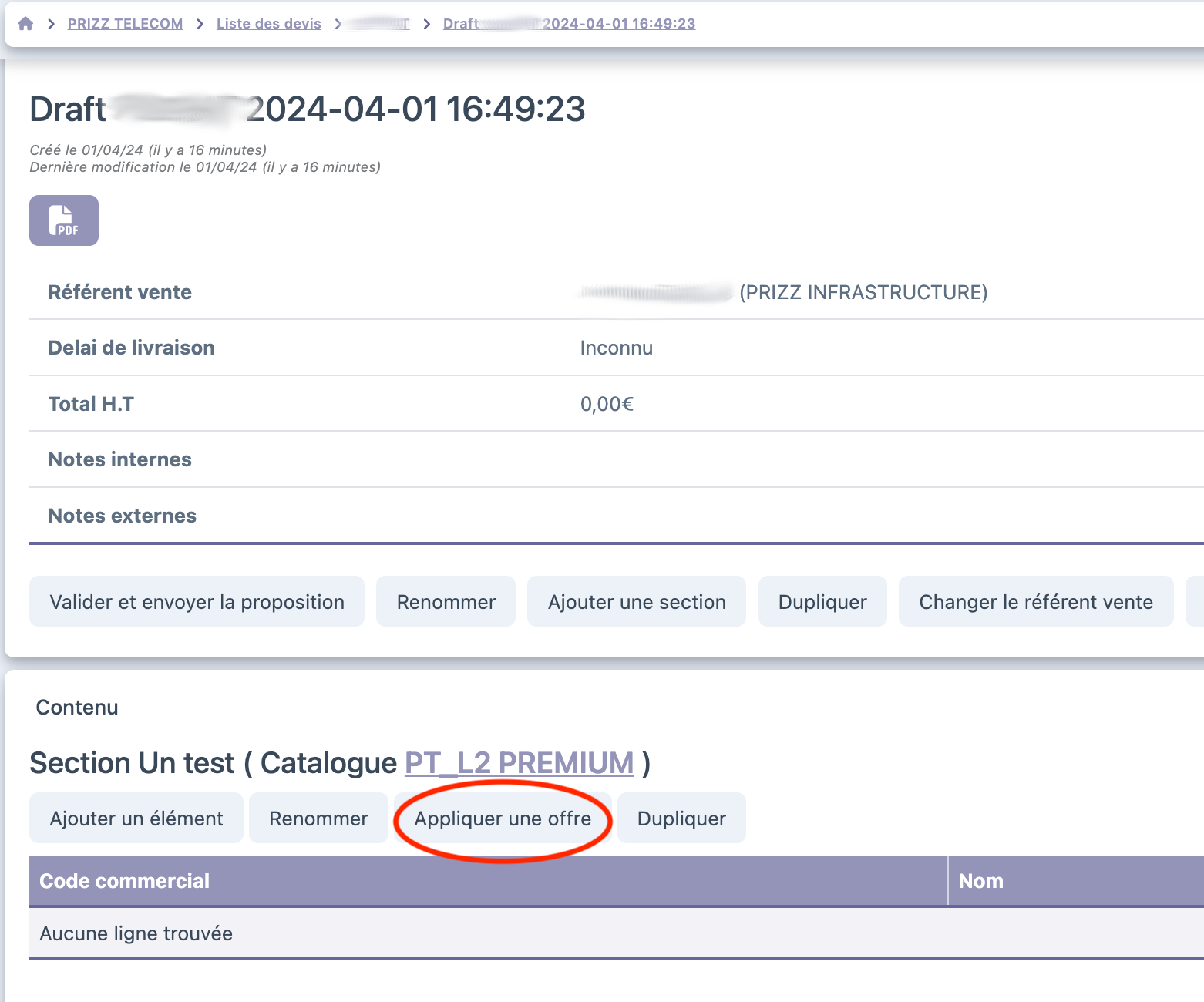 Vous êtes de retour sur la page du devis, votre nouvelle section est visible. Cliquez sur le bouton appliquer une offre.