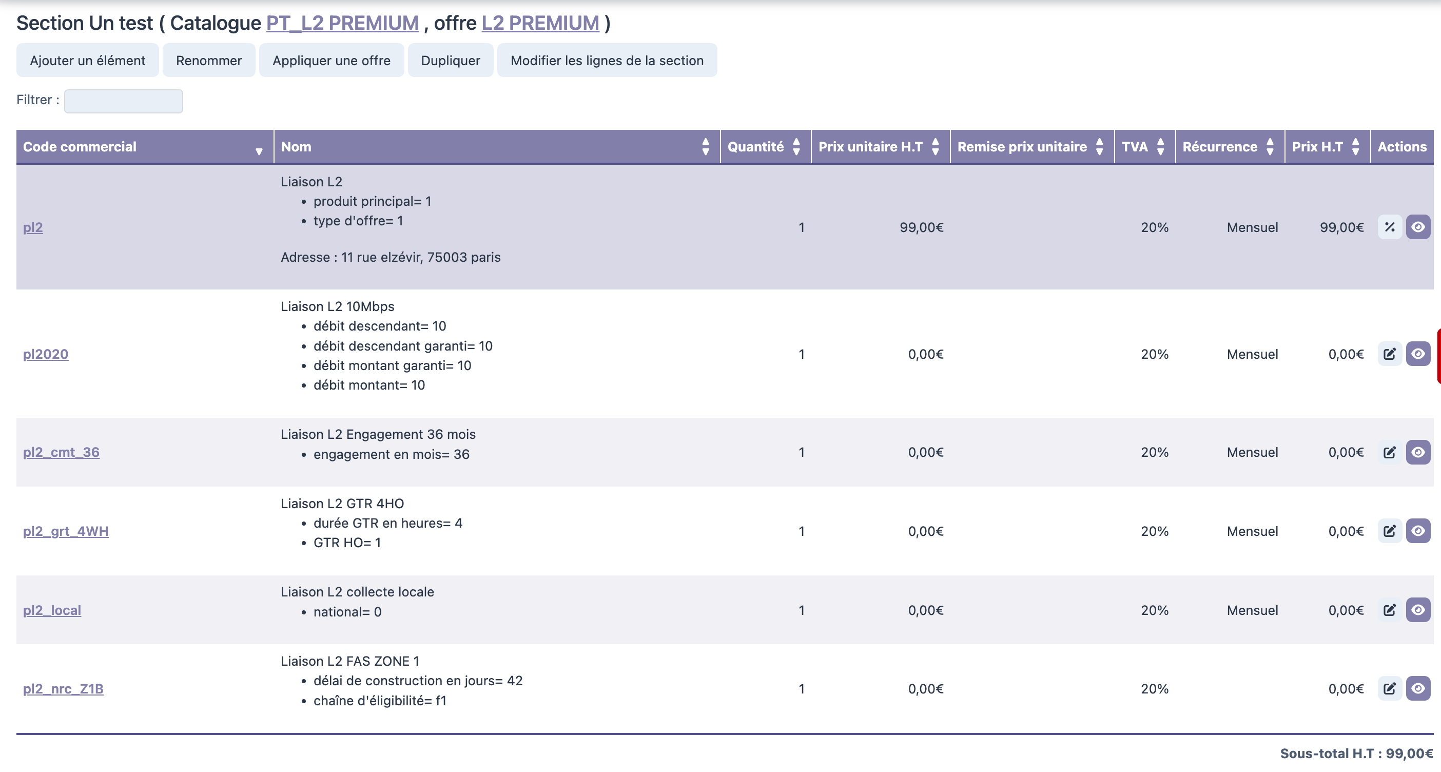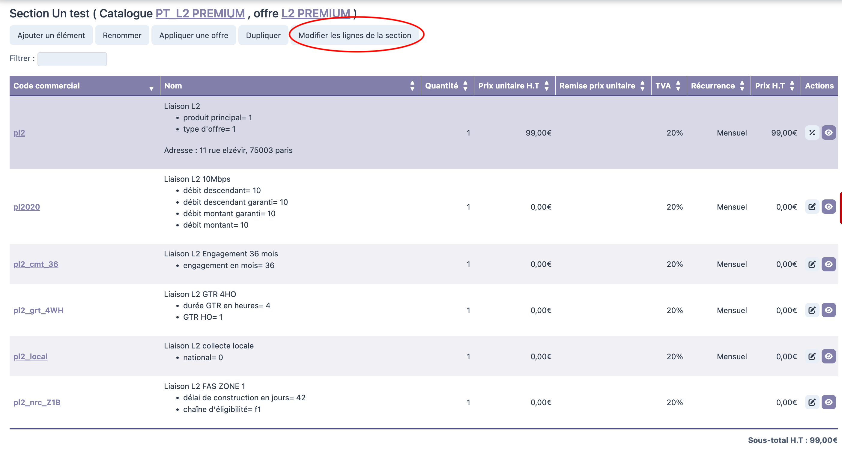 Dernière étape ajuster l’offre au besoin du client, cliquer sur le bouton modifier les lignes de la section