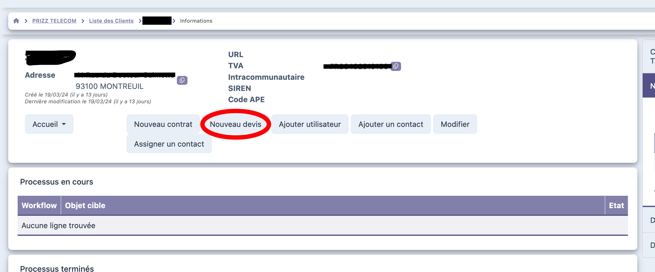 Se rendre sur la page du client et cliquer sur nouveau devis